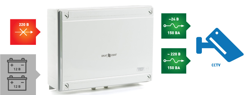 Резервированный блок бесперебойного питания Бастион SKAT-V.24/220AC с двумя выходами для передачи переменного напряжения. Сигнал о переходе в режим резерва и низком заряде батареи осуществляется с помощью выходного устройства «открытый коллектор».
