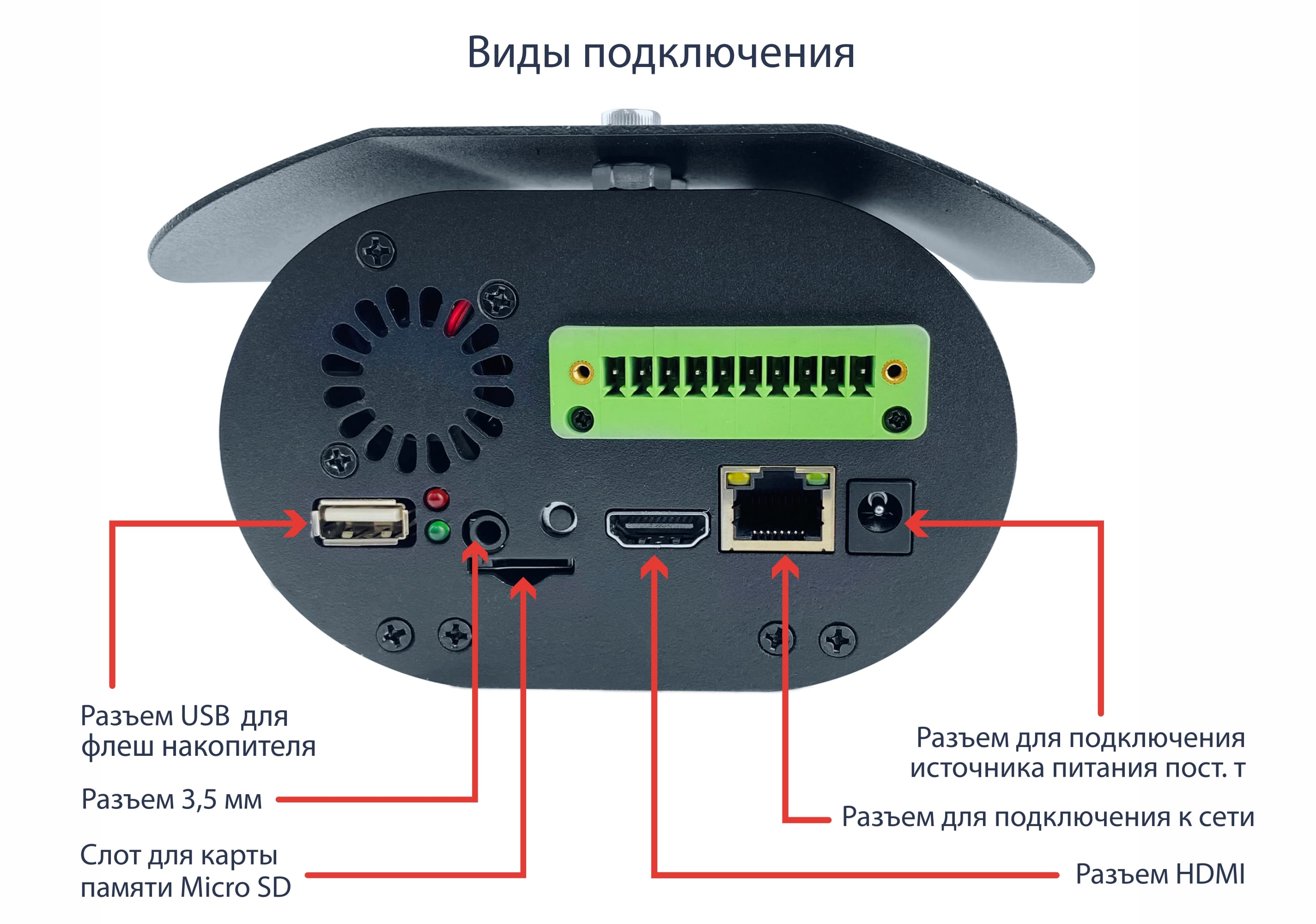- Прямое подключение флеш-накопителя для сохранения тревожных проходов посетителей — фиксирует фото человека с повышенной температурой. Разъемы RJ-45, HDMI, USB, micro SD, RS-232, сухой контакт, вход 12‑вольтового питания.