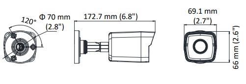 Для компрессии предусмотрены кодеки H.265, H.265+, H.264, H.264+, MJPEG, уменьшения нагрузки на сеть — 2-потоковая передача. Интерфейс: сетевой порт RJ-45. Питание — DC 12 В, PoE (IEEE 802.3af). В режиме максимальных нагрузок мощность не превышает 7 Вт. Размеры — Ø70×172.7 мм, вес — 0.28 кг.