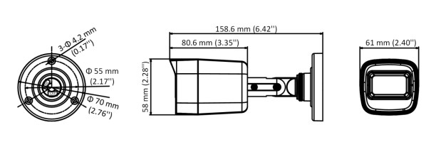 Камера укомплектована встроенным микрофоном и переключаемым видеовыходом между форматами HD-TVI/AHD/CVI/CVBS. Питание — 12 В DC. Пиковое энергопотребление — 3.7 Вт. Размер — 58×61×158.6 мм. Вес — 292 г.
